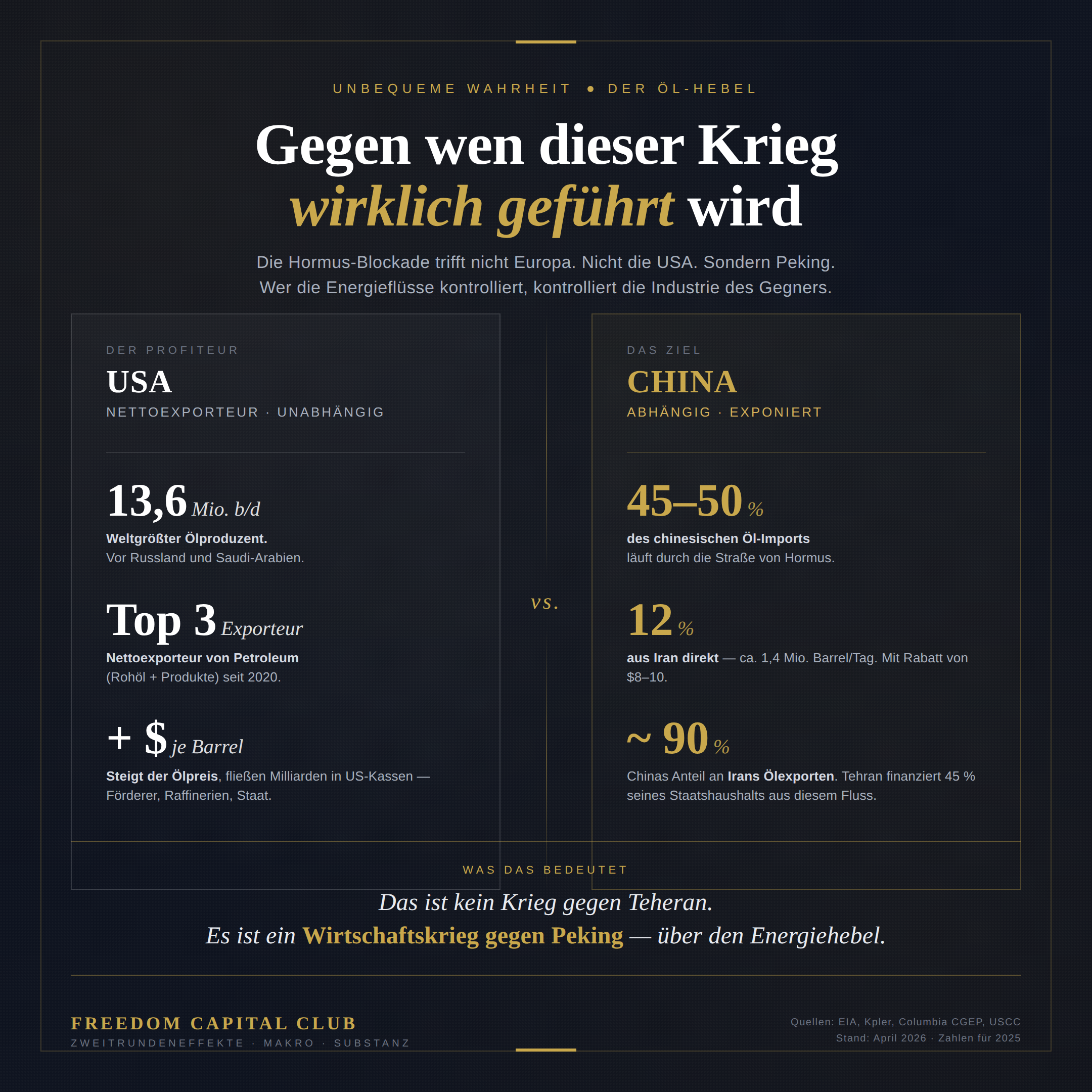 Kurzfassung: Während die Schlagzeilen von Iran, Raketen und Geiseln handeln, läuft im Hintergrund ein Wirtschaftskrieg mit einem anderen Gegner: China. Die US-Blockade der iranischen Häfen trifft nicht Europa. Sie trifft nicht die USA. Sie trifft Peking – über den Energiehebel. Wer diese Logik versteht, erkennt die Zweitrundeneffekte, bevor die Märkte sie einpreisen. Mit dieser Perspektive wird der vermeintliche Harakiri-Kurs des US-Präsident verständlich - denn er ist reine Absicht.