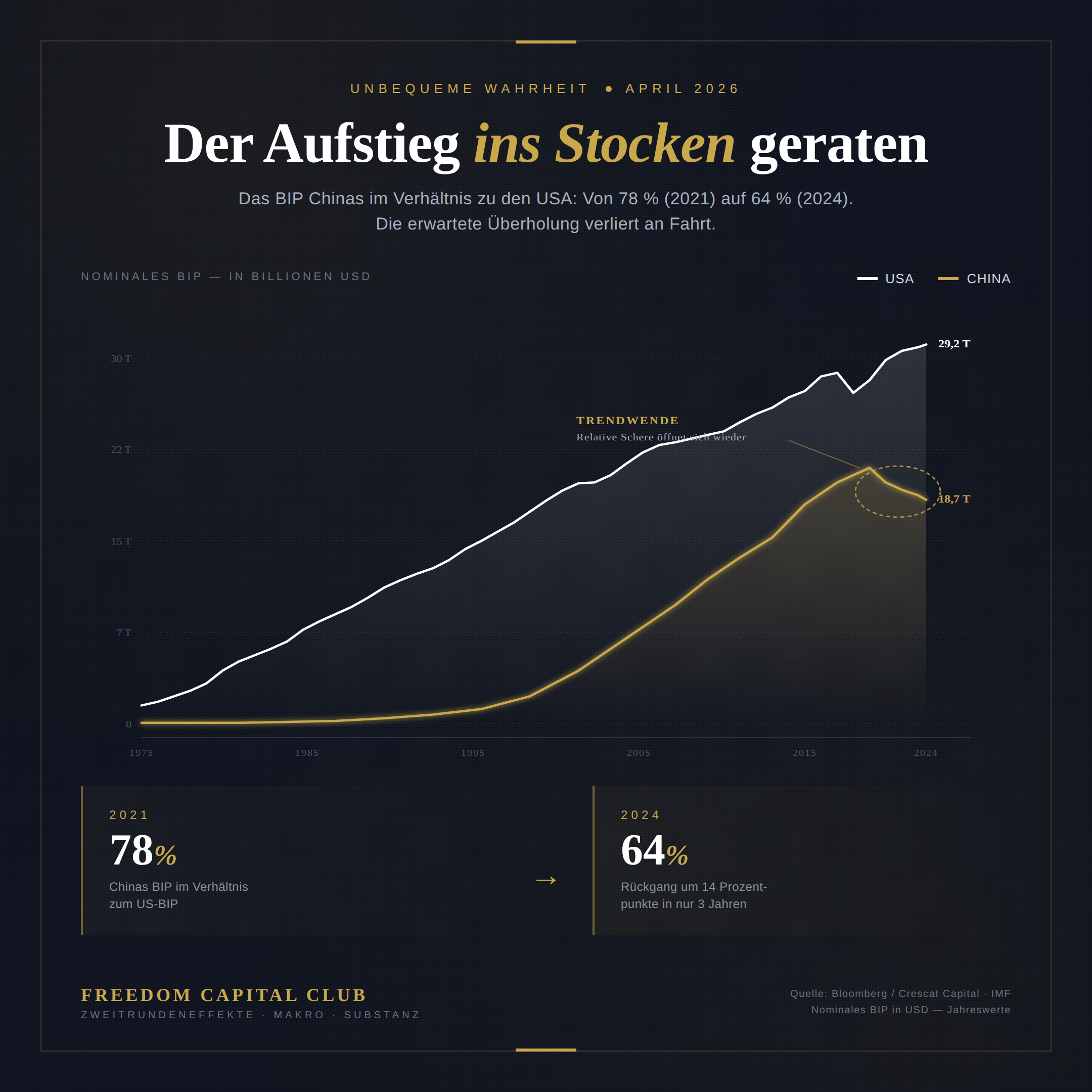 2021 lag Chinas nominales BIP bei etwa 78 % der USA. Die Frage war nicht mehr ob, sondern wann die Überholung kommt. Bloomberg, McKinsey, IWF – alle rechneten mit einem Cross-over zwischen 2028 und 2035.